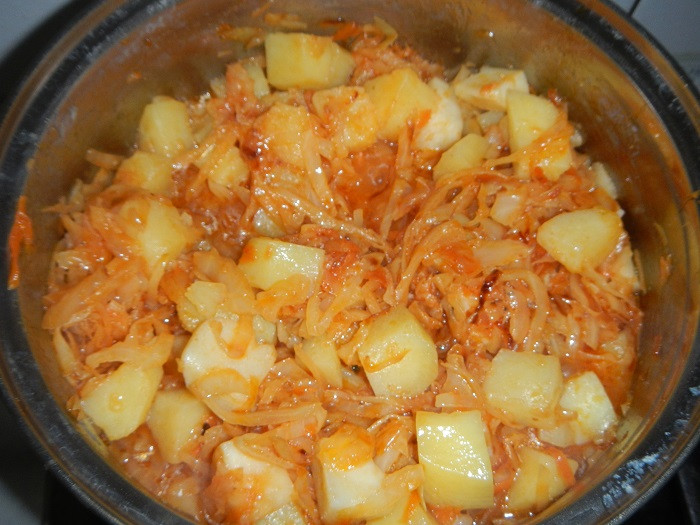 - В кастрюлю с закипевшей картошкой добавляем смесь из сковороды, перемешиваем и варим на медленном огне примерно минут 25