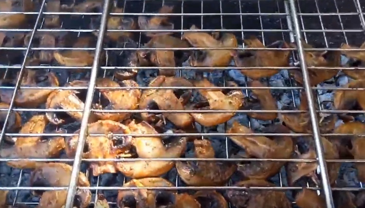 - Нанизывайте шампиньоны на шампур осторожно, чтобы они не развалились. Затем кладите на мангал и обжаривайте, переворачивая, как только одна сторона зарумянится.