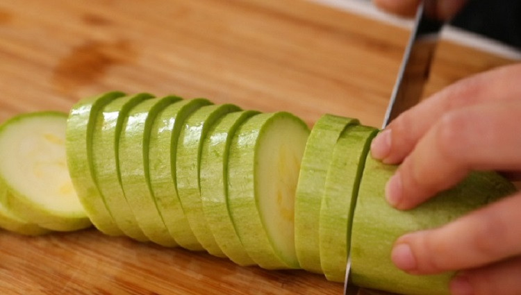 - Поскольку кабачок молодой, чистить его не обязательно, достаточно просто нашинковать его кольцами толщиной около 0,5 см.