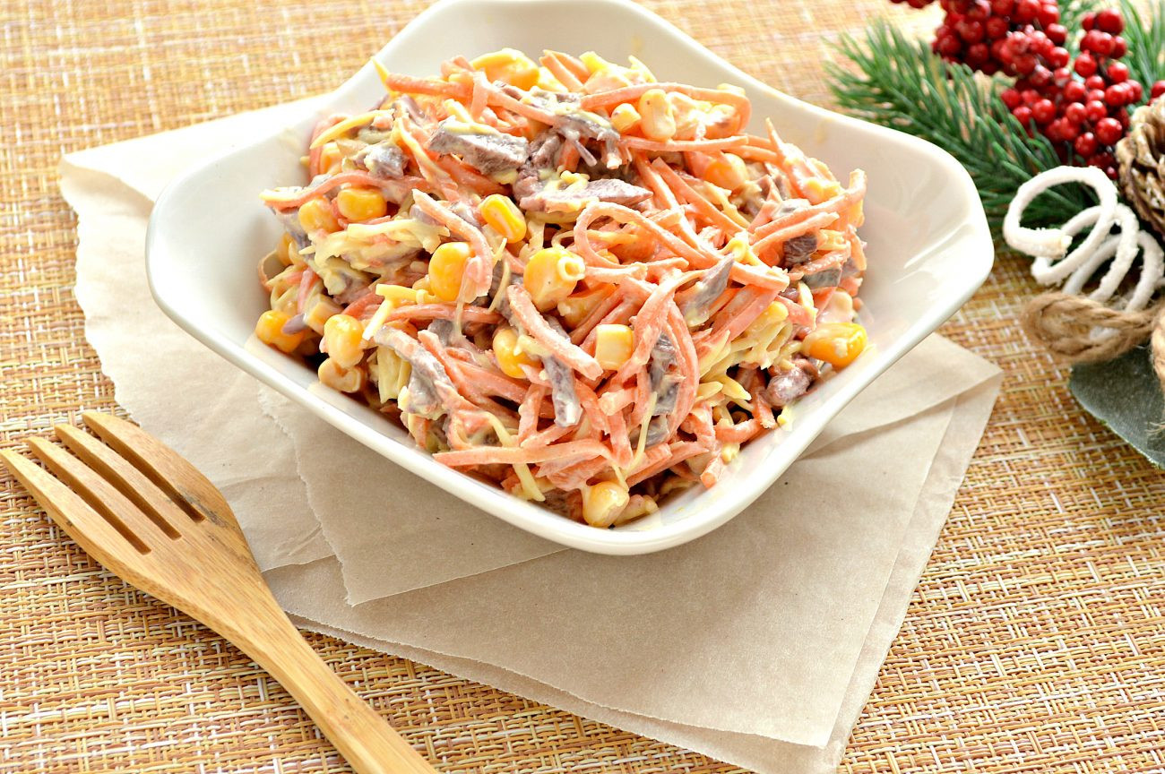 - Добавьте к салату кукурузу и морковь. Заправьте майонезом.