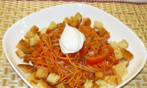 Еще один из вариантов салата с корейской морковью. Сухарики придают блюду оригинальность. Ими так весело хрустеть! Главное, подавать блюдо сразу же, пока сухарики не раскисли в нем.