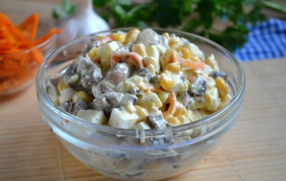 - Выложите в салатник обжаренные грибы, нарезанные яйца, добавьте корейскую морковку, консервированную кукурузу. Заправьте все майонезом, посолите.