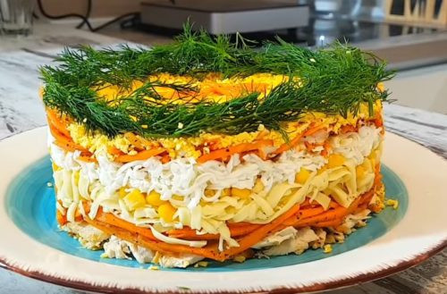 - И в конце разложите со всех сторон морковь. Салат готов! Приятного аппетита!