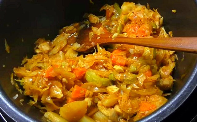 - За минут пятнадцать до конца добавить овощи со сковородки.