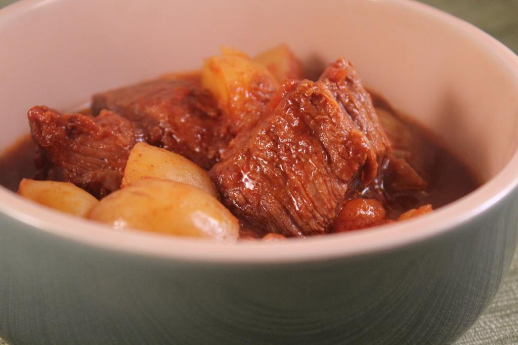 - Мясо засыпать мукой. Чуть-чуть пожарить и пересыпать в глубокую кастрюльку. Добавить картофель и залить пряным соусом. Готовить не менее получаса. За минут десять до окончания готовки добавить овощи с духовки.