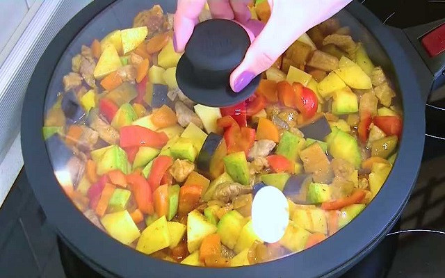 - Подавить в прессе чеснок и все тщательно размешать. Выставить режим «Тушение» на 20 минут. Накрыть крышкой и дождаться сигнала об окончании процесса, не открывая крышки. Если ваше блюдо показалось вам суховатым, а это может случиться из-за недостаточной сочности овощей, добавьте немного воды.