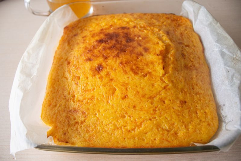 - Форму с манником поставьте на среднюю полку духовки. При данной температуре выпекайте его около 30-35 минут. Перед тем, как вынимать манник с тыквой на кефире из духовки, обязательно нужно убедиться в том, что он полностью пропекся, чтобы он не оказался внутри жидким.