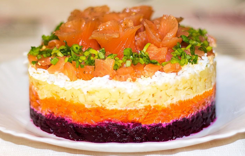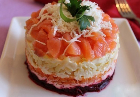 - Салат собирается в следующем порядке: свекла, морковь, картофель, яйца, лук, семга. Слои сдабриваются майонезом. Верх украшается зеленью и дольками лимона.