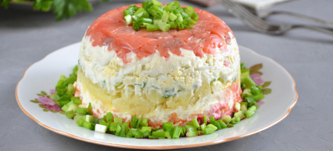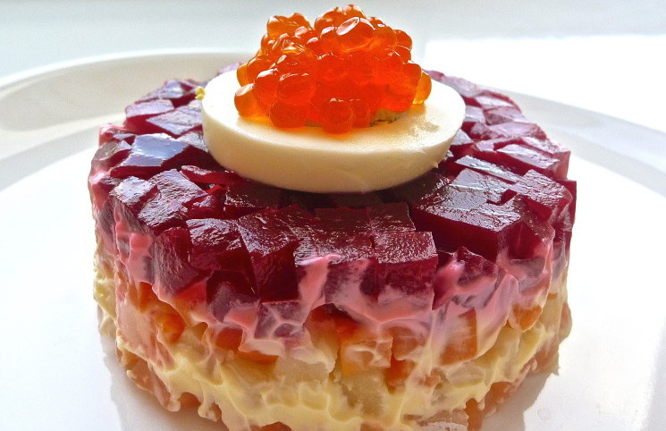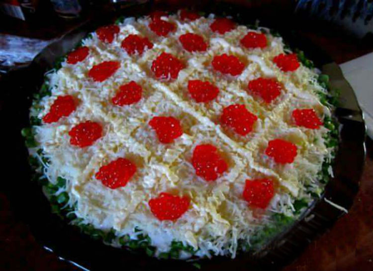 - Очередность слоев: картофель, морковь, рыба, яйца, сыр, красная икра.