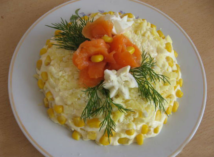 Салат семга под шубой с кукурузой и маринованным огурцом