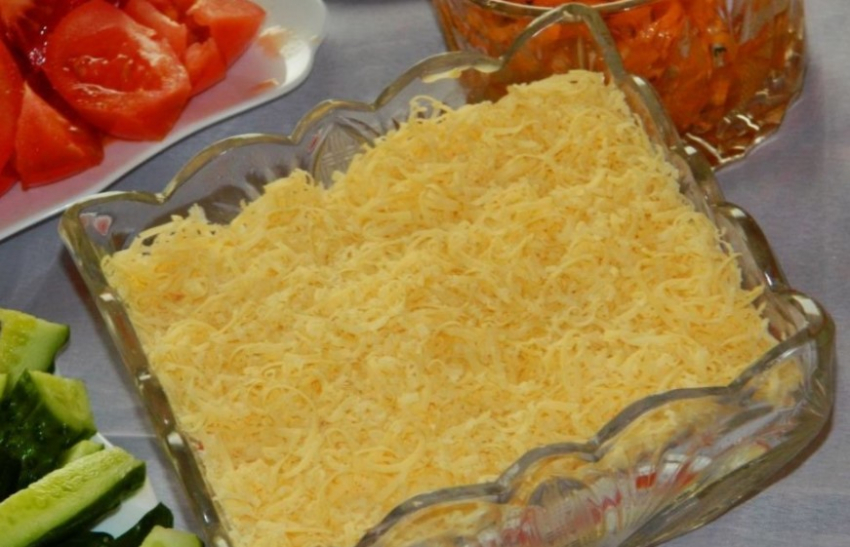 - Салат собирается слоями, в виде торта, и каждый продукт должен быть намазан майонезом.