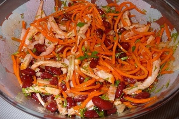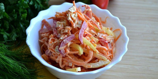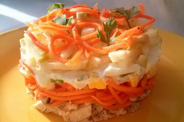 Салат с корейской морковью и курицей – капустой и грецкими орехами