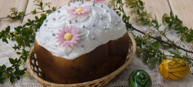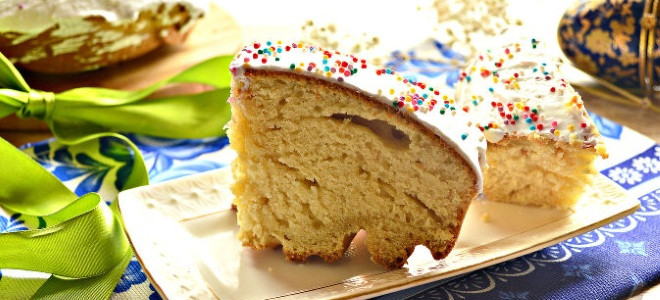 - Остывший кулич обмазываем белой помадкой и осыпаем цветной посыпкой для тортов. Как вариант, кулич можно просто обильно посыпать сахарной пудрой.