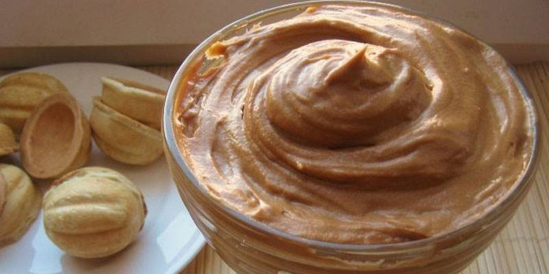 - Добавьте масло, взбейте до однородной консистенции. Далее добавляйте небольшими порциями сгущенку, не переставая работать прибором. Уберите на час в холодильник.
