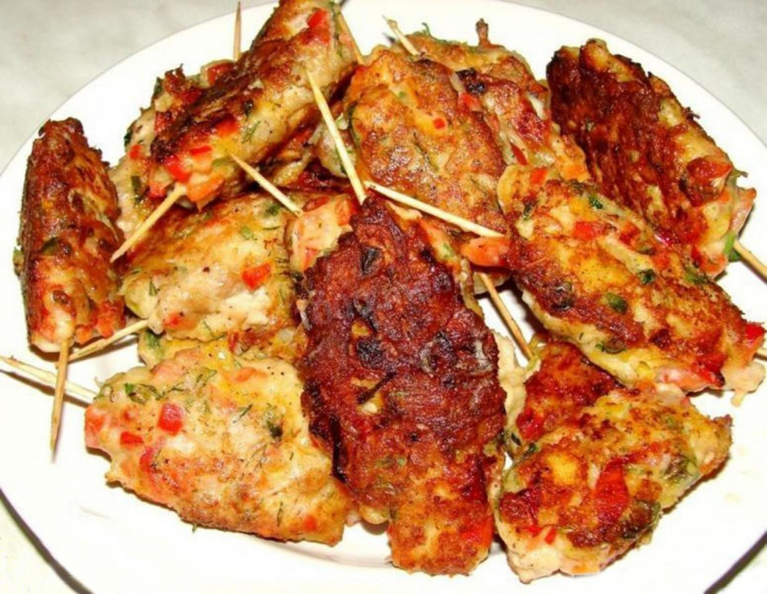 - Сформировать продолговатые котлетки, нанизать каждую на укропную палочку.