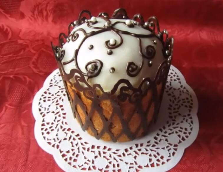 - Сахарную пудру можно комбинировать с какао или натертым шоколадом и формировать интересные узоры. С одной стороны — простота украшения, а с другой стороны — изящество и нежность сделают ваши куличи уникальными.
