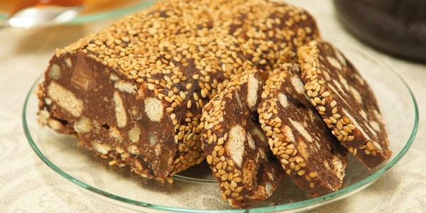 Шоколадная колбаса из печенья, сгущенки, орехов и цукатов