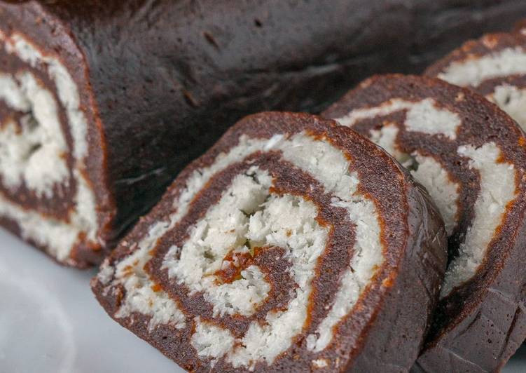 - Выкладываю на кулинарную бумагу из пергамента шоколадную массу. Сверху добавляю белый крем. Заворачиваю лакомство в рулет. Прикрываю пищевой плёнкой.