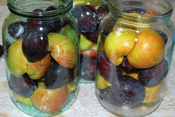 - В чистые и сухие банки укладывают подготовленные персики, сливы, груши, разрезав плоды на половинки или четверти.
