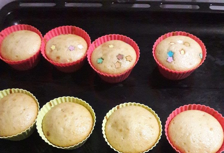 - Запекаем в заранее разогретой до 180 градусов духовке в течении 15 минут. Готовность проверяем зубочисткой. Если на зубочистке не остается тесто, значит кексы готовы.