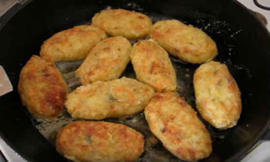 - Из теста сделать биточки, обмакнуть в кляр, обсыпать панировкой и обжарить с двух сторон.
