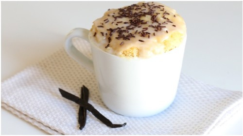 - Испеченные кексы извлеките из кружек, переверните на тарелочки и полейте, если желаете, сливочной глазурью, которую можно приготовить из 1 ст. л. сливочного масла, 2 ст. л. сахарной пудры и 1 ст. л. молока.