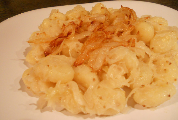 - Капусту отожмите от рассола и положите в лук. Перемешайте и потомите около 15 минут.