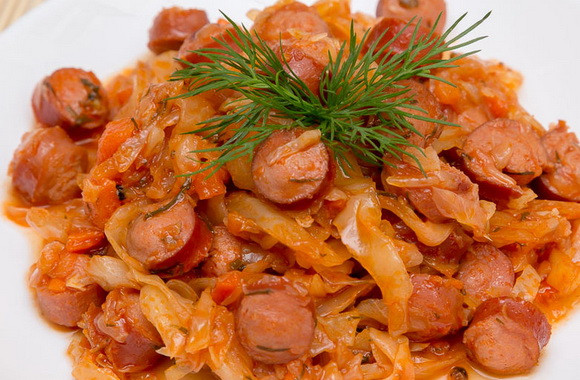 Сытное и недорогое блюдо — капуста тушеная с картошкой. Традиционно в нее добавляют томатную пасту или сок и тушат в кастрюльке или сковороде. Однако можно разнообразить такое блюдо — грибами, мясом, фаршем, сосисками, копченостями, приготовить в духовке или мультиварке.