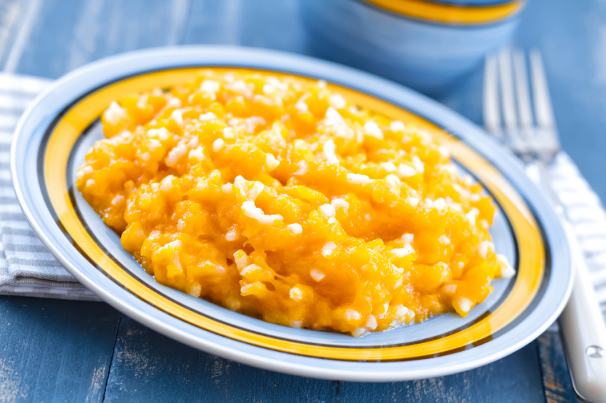 - После того как тыква приготовится с помощью толкушки или блендера измельчите ее в пюре до однородной консистенции.