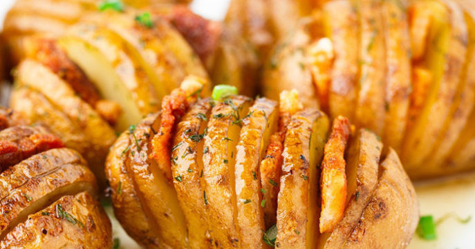 Весьма эффектно выглядит картошка-гармошка. Это блюдо можно подать и на праздничный стол. Готовить такую картошку можно с копченым салом, а можно с ветчиной и сыром. В последнем случае перед запеканием на каждую картофелину нужно положить по кусочку сливочного масла.