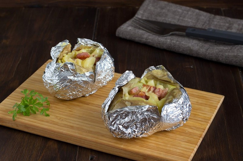 - Картошку поштучно обернуть пищевой фольгой, запекать в духовке или на гриле 15 минут.