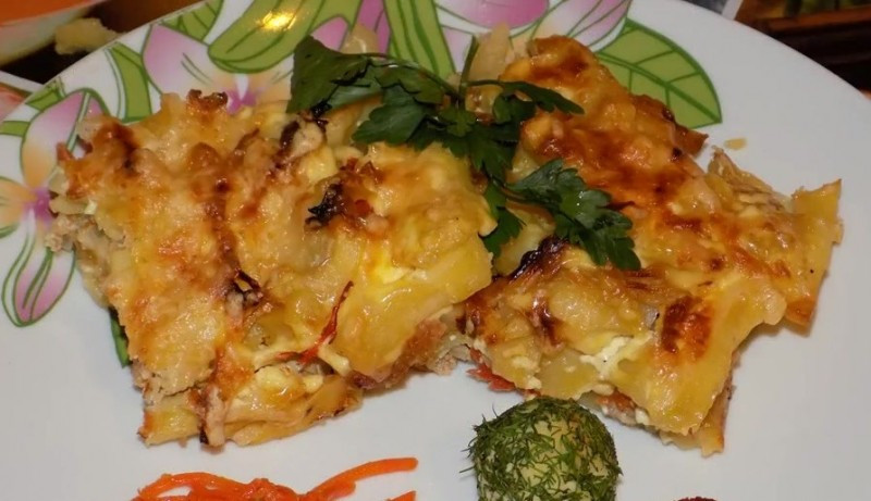 - Переходим к сборке блюда. Форму для выпекания смазываем растительным маслом и выкладываем первый слой из половины картофеля. Подсаливаем и перчим сверху. Затем посыпаем 1/4 тертого сыра. Раскладываем слой из половины репчатого лука.