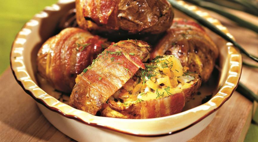 На плите готовим те варианты, где в картошке используется сквозное отверстие для начинки. Сначала отвариваем картофель в мундире. Затем, после фаршировки, выкладываем на дно кастрюли овощи в вертикальном положении, добавляем бульон и готовим блюдо на минимальной мощности. Не забываем на время приготовления закрыть его крышкой. Чтобы готовые экземпляры подрумянились, отправляем перед подачей к столу на 5-10 минут в разогретую духовку.Картофель, фаршированный беконом