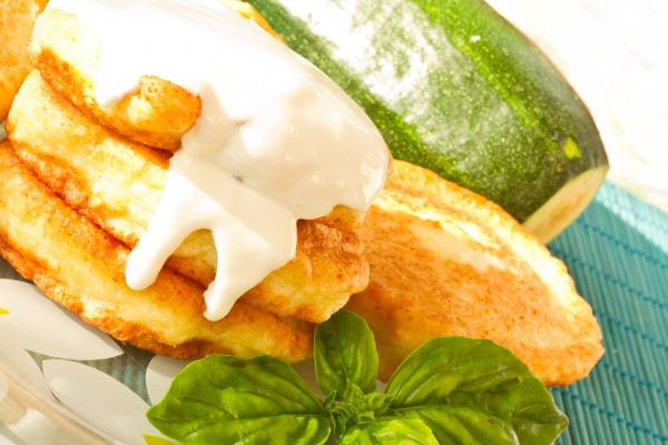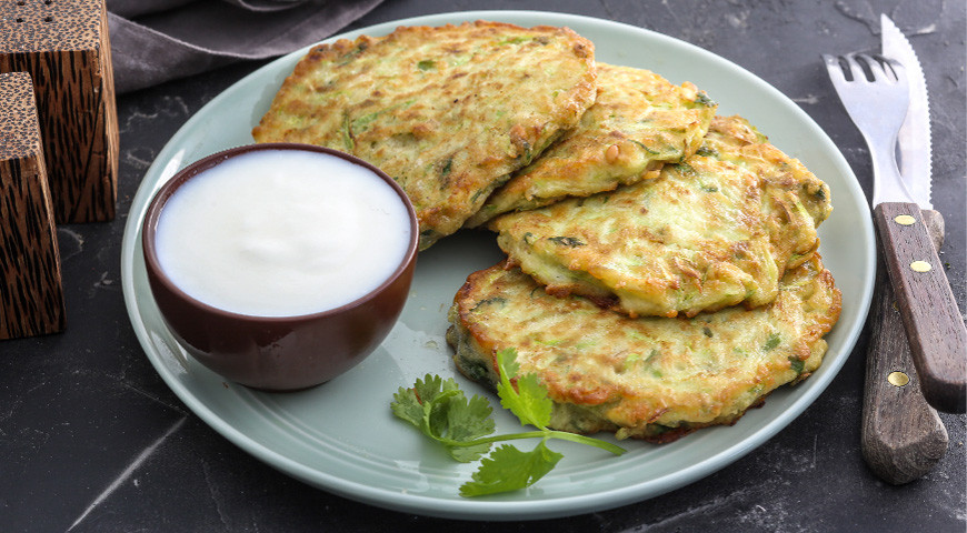 - Подавайте оладьи с соусом из йогурта и зелени, горячими.