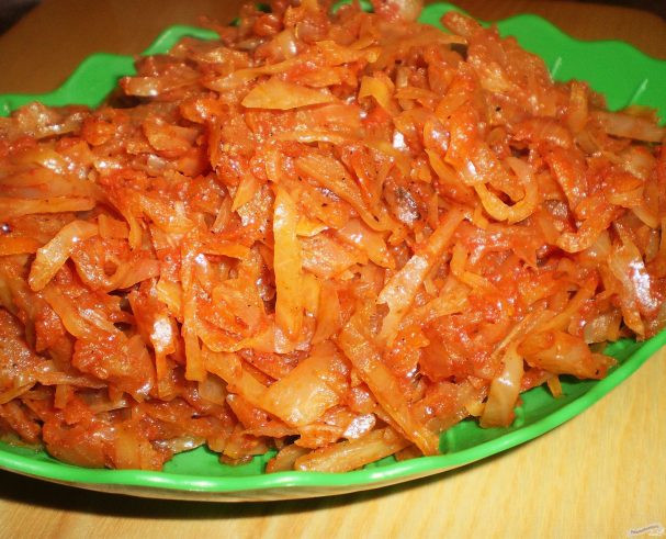 - Теперь наступает очередь капусты. Засыпаем ее, добавляем специи, соль по вкусу и томатную пасту или кетчуп, можно разнообразить блюдо различными соусами.