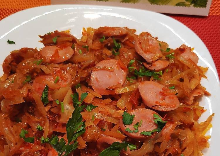 Капусту по этому рецепту еще называют «Студенческая», потому что при приготовлении вместо мяса используются сосиски. Такое блюдо готовится быстро, а на покупку продуктов денег уйдет мало.