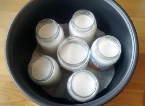 - В первую очередь смешиваем молоко и закваску, а затем разливаем получившуюся смесь по емкостям (можно взять баночки из-под детского питания или специальную посуду для мультиварки