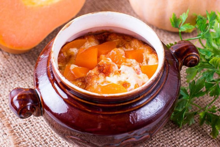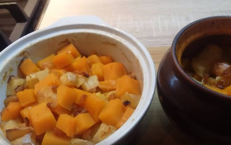 Кардинально другой сытный рецепт остался напоследок – это тыква с яблоками в горшочке.