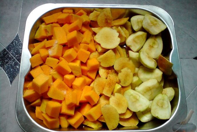 - Яблоки надо вымыть, очистить от сердцевины и кожицы, затем нарезать крупными кусочками, размером примерно 2 на 2 см. Тыкву тоже нужно почистить от кожицы и нарезать такими же по размеру, как и яблоки, но более тонкими кусочками.