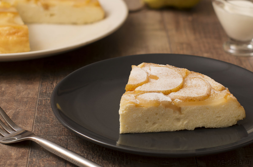 - Готовую запеканку остужаем, примерно в течение 15 минут, а затем украшаем сахарной пудрой и вареными грушами.