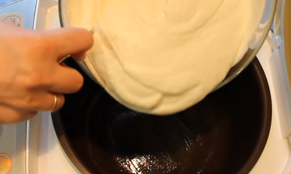 - Теперь берем и смазываем чашу мультиварки сливочным маслом, либо маргарином, выкладываем в нее получившуюся массу, аккуратненько разравниваем ложечкой и закрываем крышку.