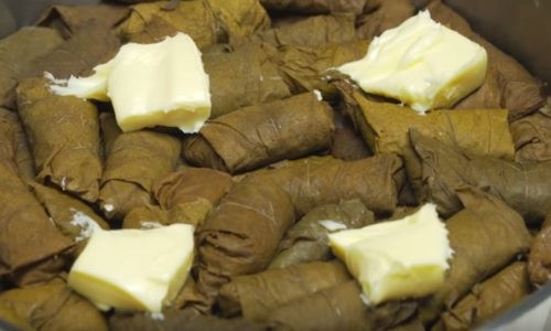 - Выложите всю долму в кастрюлю «швами» вниз, сверху положите еще 25 грамм масла – разделите его на несколько кусков. Затем прикройте виноградными листьями по всей площади. Сверху опять же положите тарелку и залейте все водой – она должна доходить до верхнего слоя долмы. Готовьте на медленном огне около часа.