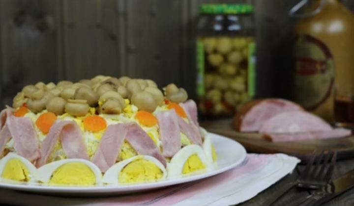 А сейчас вашему вниманию слоеный салат «Грибная полянка» с шампиньонами и ветчиной.