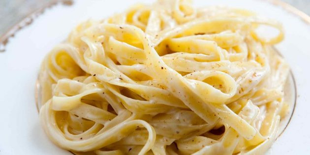 В классическом варианте пасту смешивают лишь с нежнейшим сливочным соусом, который готовится всего из трёх ингредиентов. Позже соус стали делать более кремовым и начали добавлять к нему курицу, грибы или креветки.