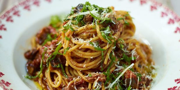 - А пока готовится соус, стоит заняться спагетти. Отвариваем их до состояния аль денте. Далее макароны нужно аккуратно выложить на большую тарелку и полить сверху соусом. Чтобы подчеркнуть богатый вкус этого ароматного блюда, посыпьте все сверху мелко натертым пармезаном.