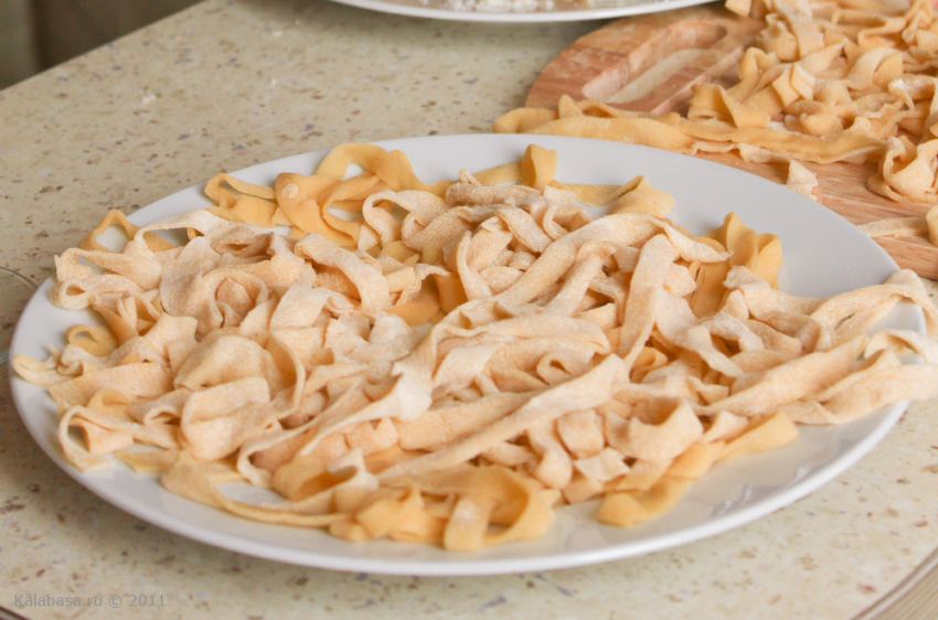 - Расправьте пасту и оставляйте на хранение либо приступайте к готовке. Хранить свежую пасту можно в холодильнике не более суток, а можно расфасовать её по пакетам, предварительно свернув в «гнёзда», и отправить в морозильную камеру.