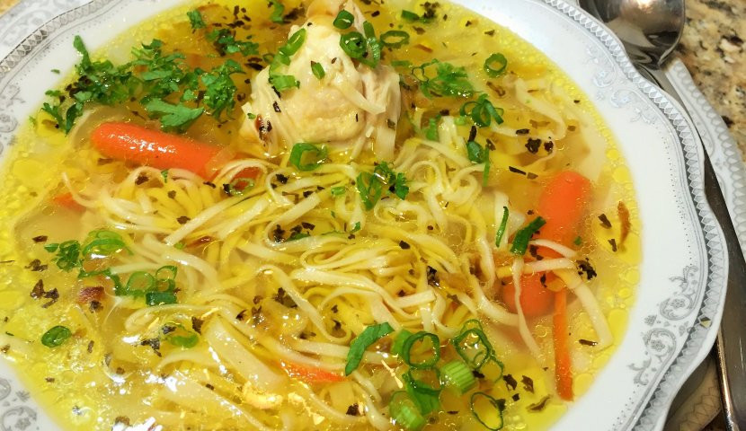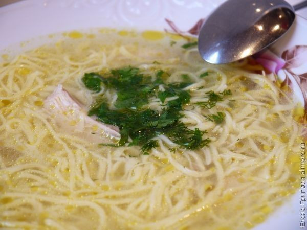 Суп по-домашнему с курицей и яичной лапшой и чесноком