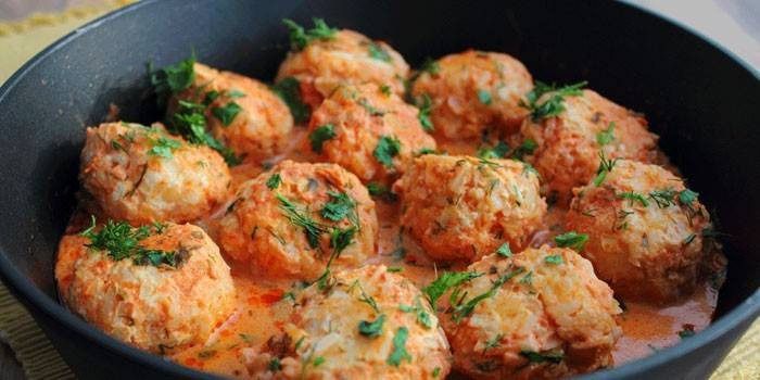 - Следующим нужно подготовить соус: остатки лука поджарьте на растительном масле, положите к нему сметану, томатную пасту, перемешайте и тушите несколько минут.