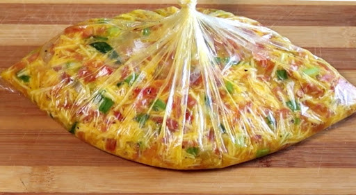 - В заранее приготовленный пакетик вылейте смесь, и крепко завяжите или зафиксируйте его резинкой. Целлофановый мешочек с омлетной массой опустите в теплую воду и варите в течение получаса.