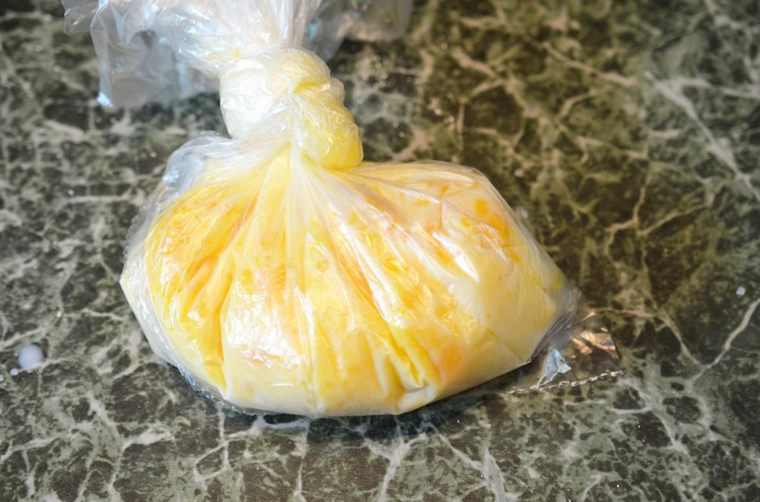 - В 2 пакета, вложенных друг у друга, вылить взбитую яичную смесь и тщательно завязать.